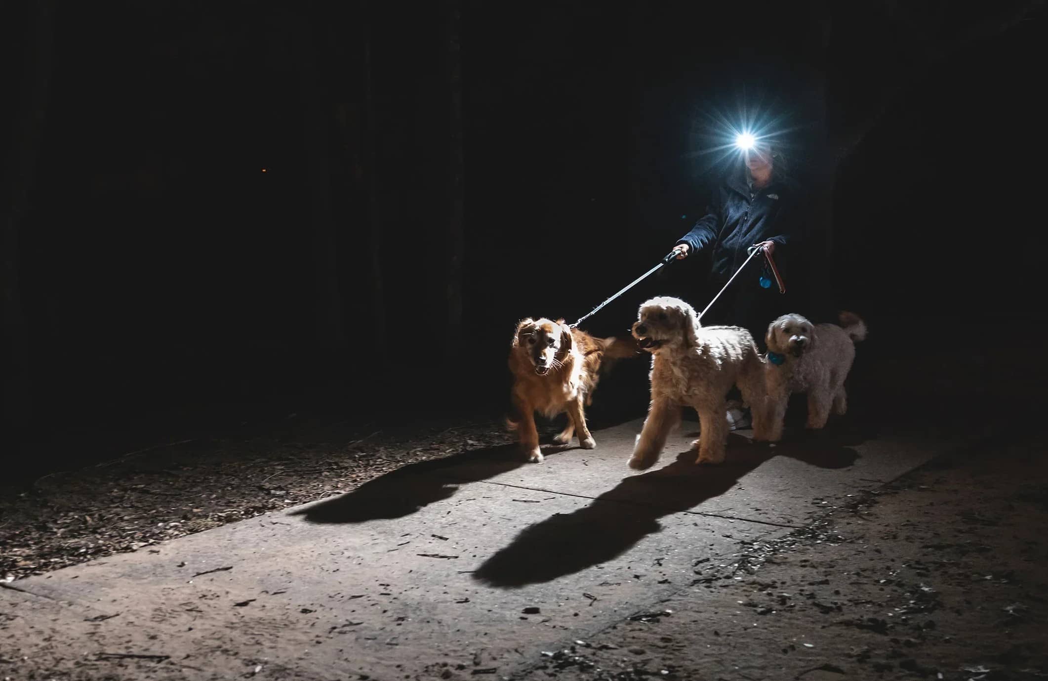 Sử dụng dây xích, vòng cổ có phản quang để bắt đèn pha và đèn đường. Đối với những khu vực tối hoặc khu vực nông thôn, nên sử dụng loại vòng cổ có đèn LED phát sáng vị trí của chú chó, ngoài ra bạn cũng cần mặc áo phản quang hoặc có đèn pin nhỏ để đảm bảo người lái xe dễ dàng nhận ra bạn và chú chó của bạn.